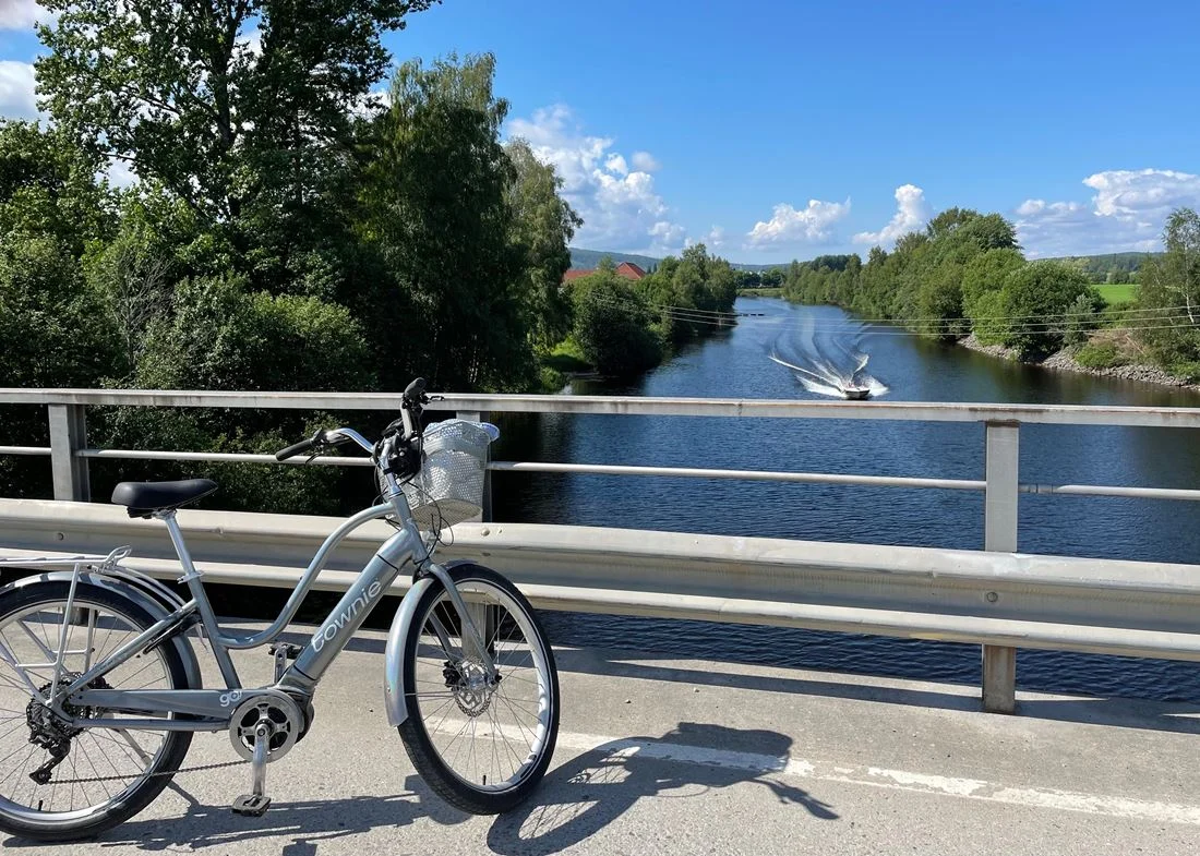 Med el-sykkel går bakkene unna som en lek. Det er høysesong for markblomster i grøftekantene, og ved Skredderstuen beiter sauer og hester. I bakken ned mot Oppstadbrua viser speedometeret 35 kilometer i timen.
