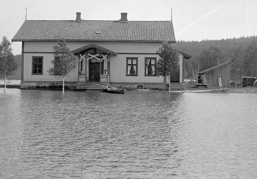 Bildetekst: 1908 er ikke beskrevet med noen stor flom på Oppstad, men 3. juni det året tok Hans Kjølstad et bilde av Årstad skole, der vannet står helt opp til trappa.