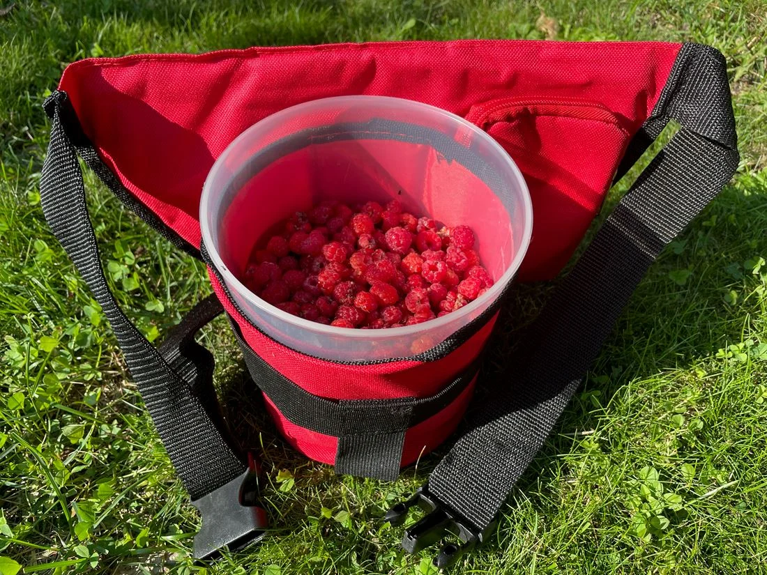 Jeg er heldig som har villbringebær på skogstomta i hagen. Det er blitt et par kilo hittil i år, og den er fortsatt mulig å plukke. Årets skudd av bringebærplanter gir bær neste år, skuddene med årets bær visner. Et magebelte med boks er fint å plukke i, da kan jeg bruke begge hendene.